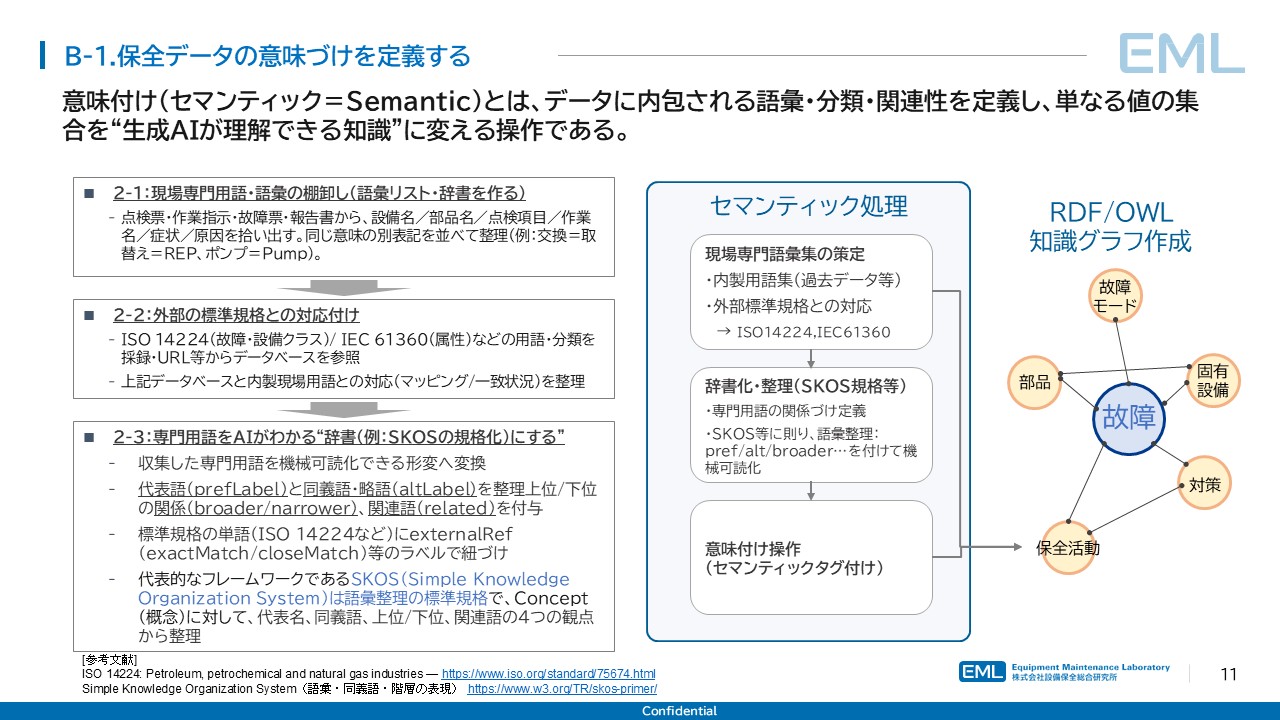 加えて、ISO 14224等の標準規格の用語に対してexternalRef(exactMatch/closeMatch)のラベルで紐づけることで、社内辞書と国際規格の間の意味的接続が確保される。