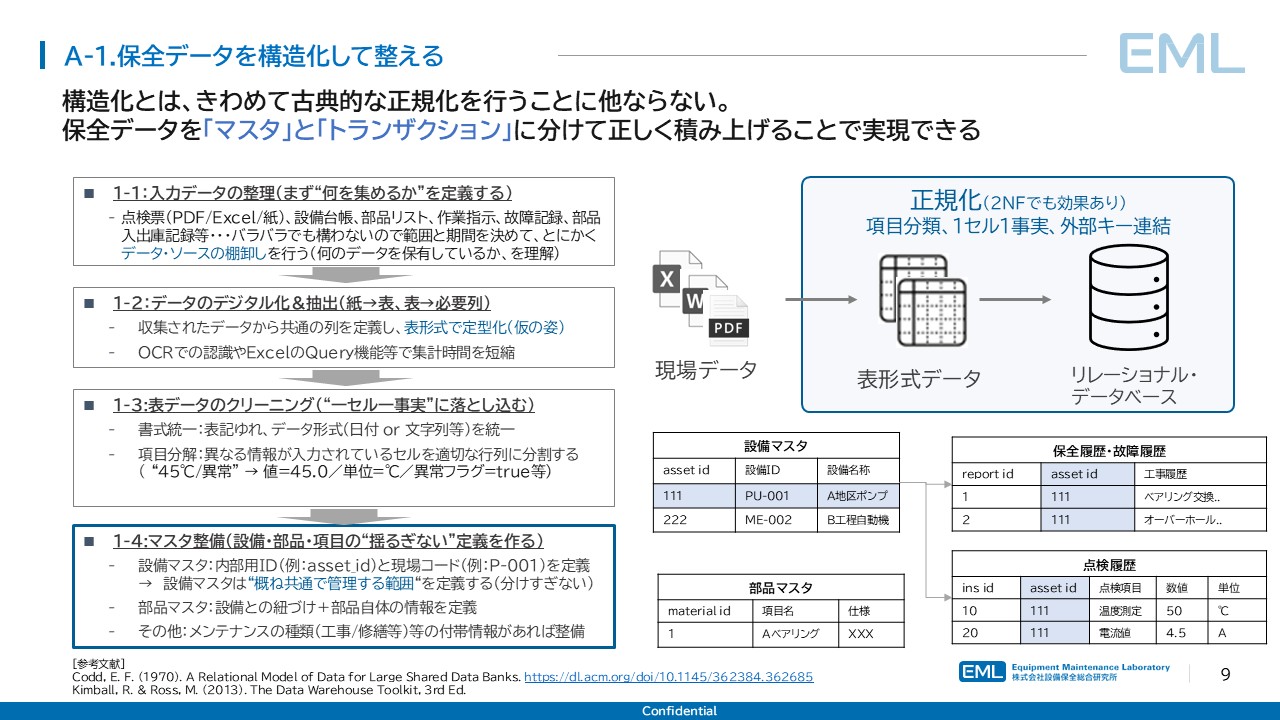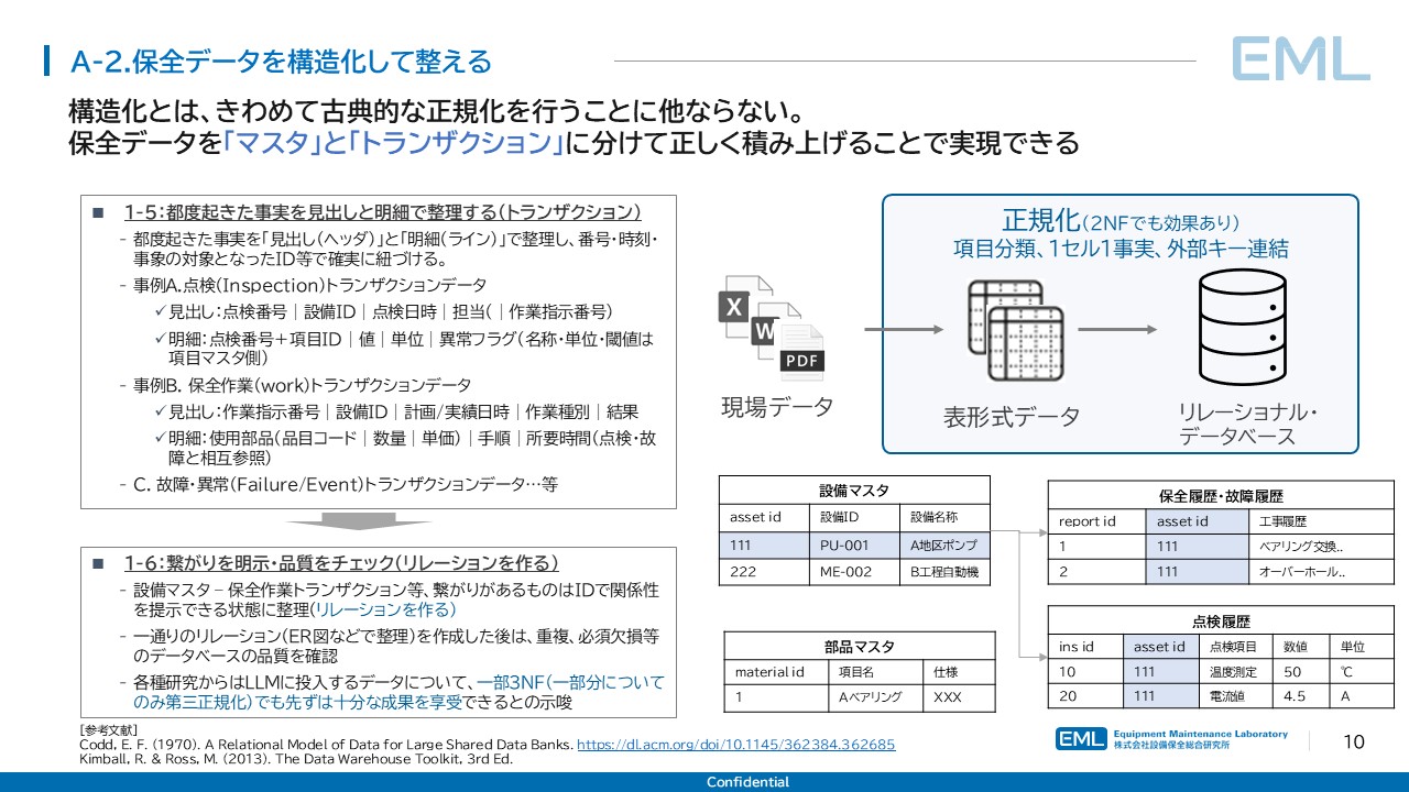 データの構造化と聞くと最新の技術を想像するかもしれないが、その本質は1970年にE. F. Coddが提唱した関係モデル[1]に基づく正規化という、データベース理論における古典的な手法である。正規化とは、データを「マスタ」(設備名称・部品仕様など変わりにくい基礎情報)と「トランザクション」(点検記録・故障報告など都度発生する事実データ)に分離し、各テーブル間の依存関係を明確にする操作を指す。