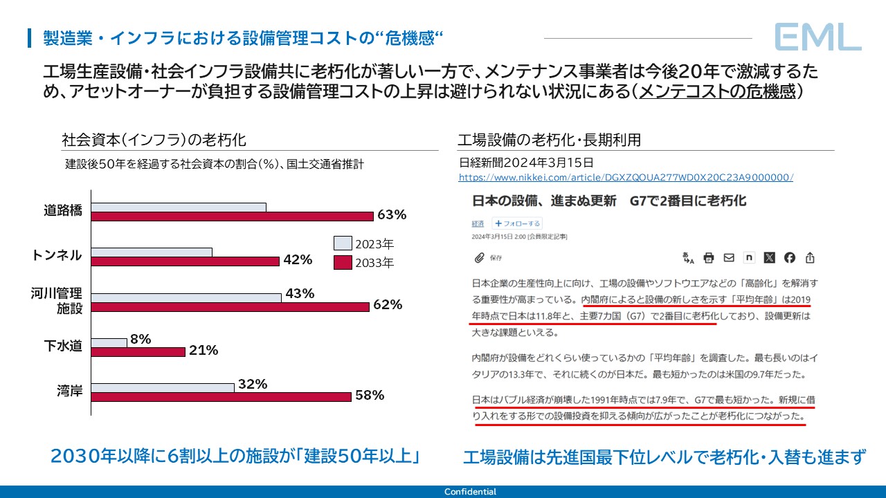 設備が古くなれば故障リスクは高まり、メンテナンスコストも増加する。さらに、メンテナンスを担う事業者や技術者は今後20年で大幅に減少すると見込まれている。需要は増える一方で供給は減る――設備管理コストの上昇は構造的なものであり、個別の工夫だけでは吸収しきれない規模になりつつある。