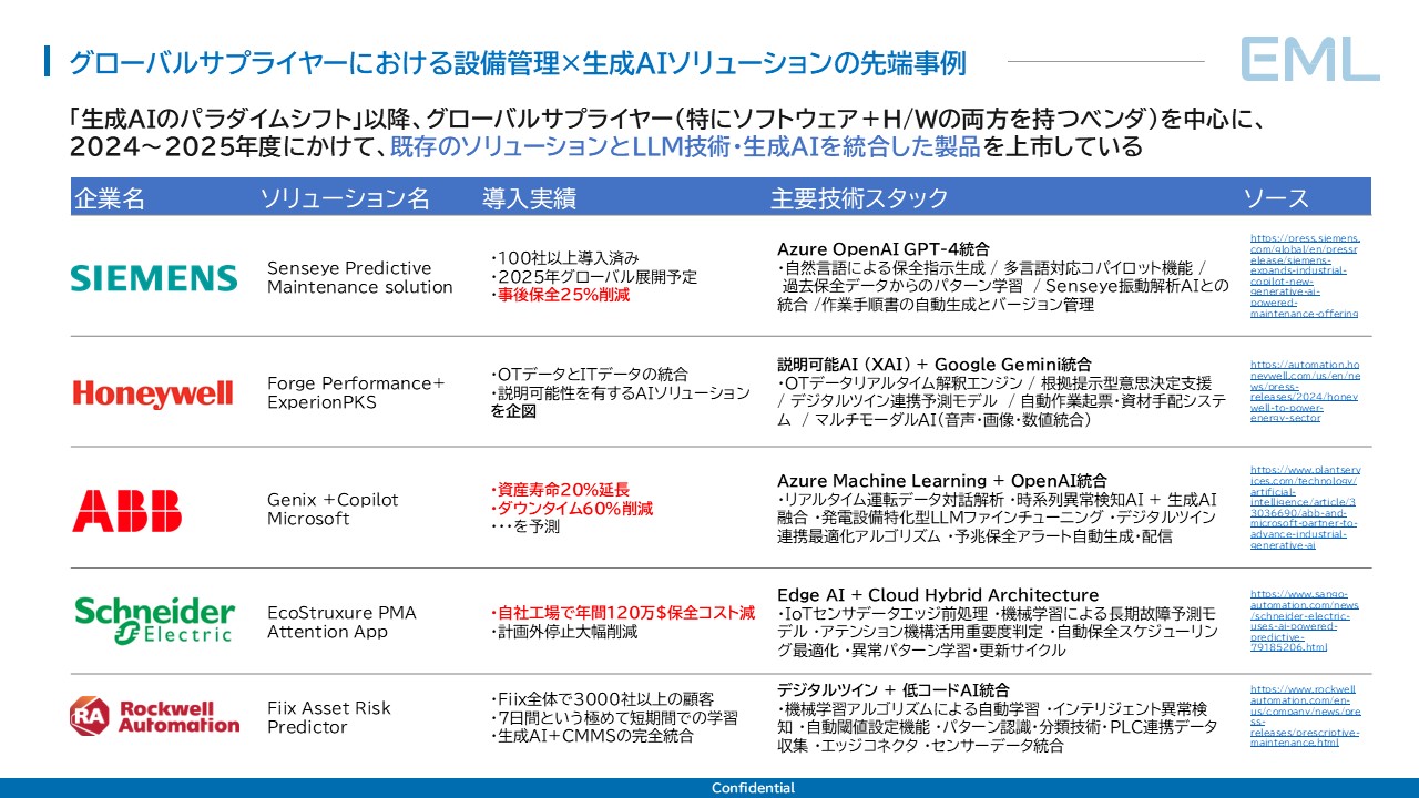 5社に共通する最大の特徴は、「ゼロからAIシステムを構築した」のではなく、「既存の保全管理プラットフォームにLLMを統合した」という実績である。SiemensはSenseye振動解析AIにAzure OpenAI GPT-4を重ね、ABBは既存のGenixプラットフォームにMicrosoft Azure OpenAIを統合し、RockwellはFiix CMMSに生成AI機能を追加した。いずれも、すでに数百~数千社が利用する基盤の上にLLMを載せるという戦略を選択している。