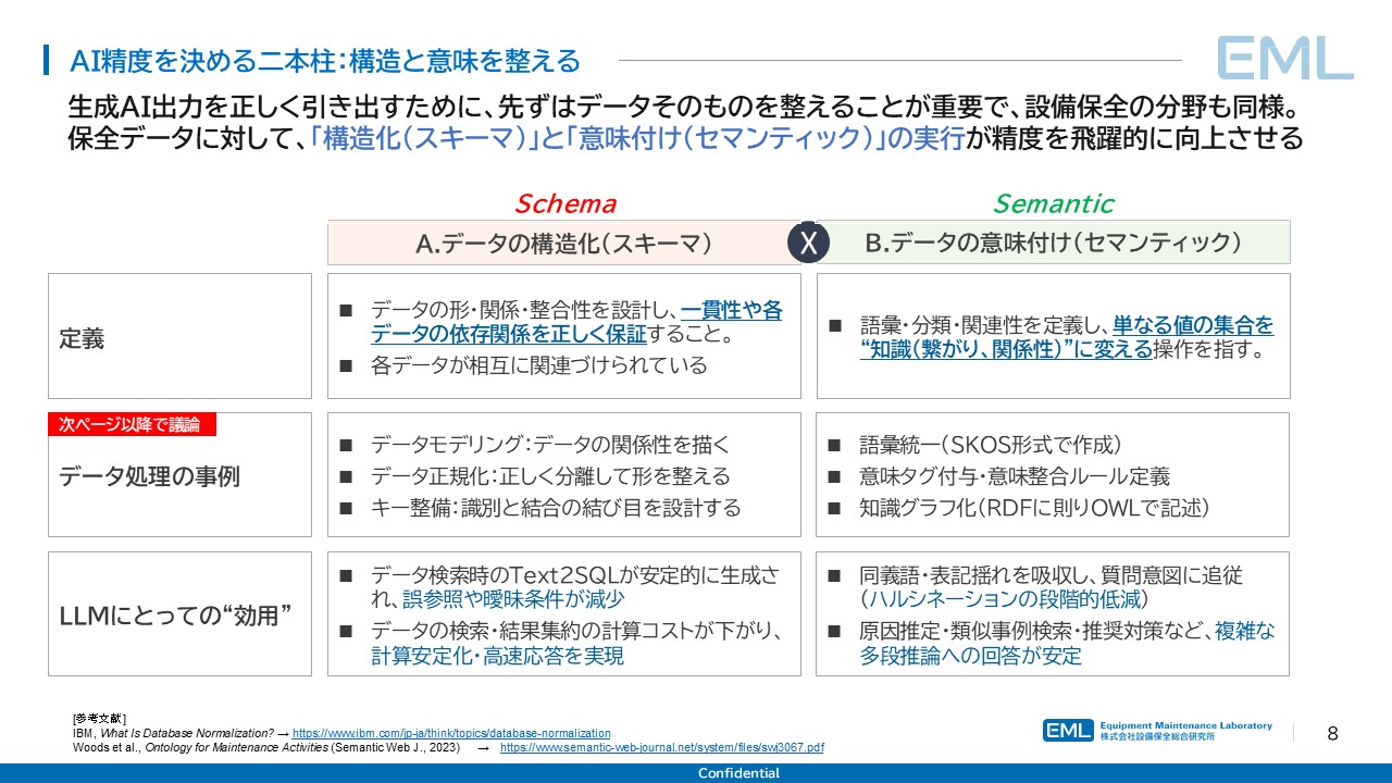 設備保全データをそのままChatGPTに投入しても精度は出ない。非構造化データと構造化+意味付けデータでは回答精度に4倍以上の差が生じる。AI精度を左右するデータの構造化(スキーマ)と意味付け(セマンティック)の二本柱を分析する。