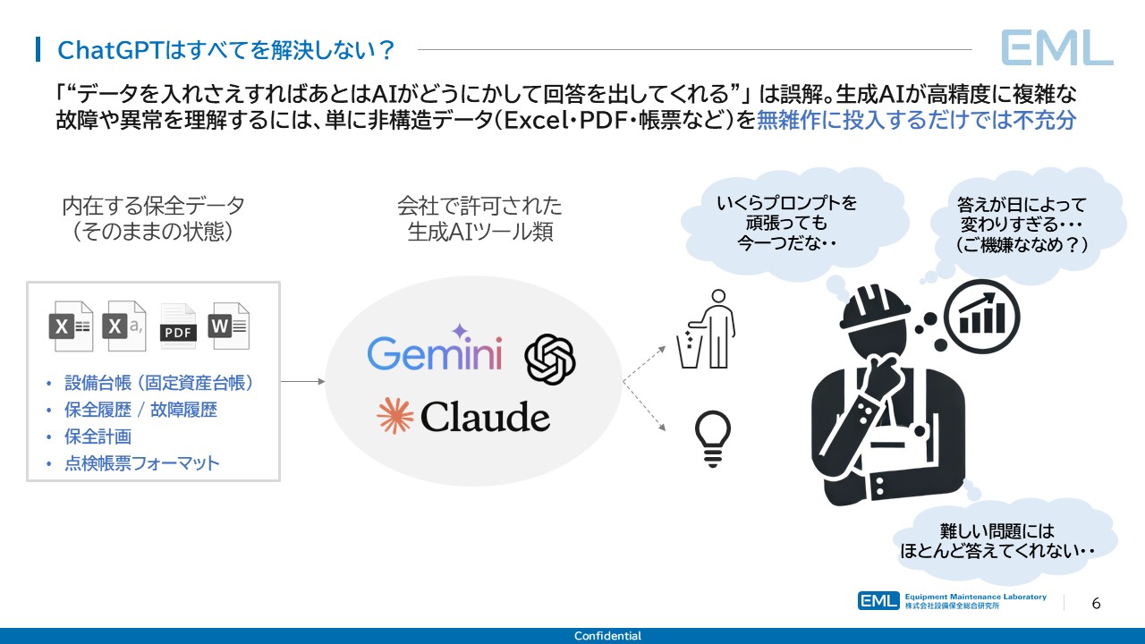 Zone2への移行を試みる企業がまず直面するのは、「AIに自社データを投入したが、期待したほど正確な回答が得られない」という事態である。設備台帳(固定資産台帳)、保全履歴・故障履歴、保全計画、点検帳票フォーマット――これらは多くの現場でExcelやPDF、あるいは紙の帳票として存在する。これらの「そのままの状態」のデータをLLMに渡しても、回答の正確性と安定性には顕著な限界が生じる。